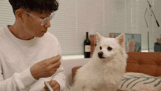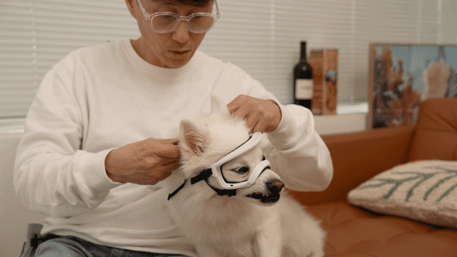 반려견이 견글라스의 질감에 익숙해졌다면, 경계심을 풀기 위한 교육을 진행합니다.