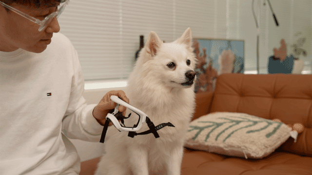 반려견이 경계심을 많이 풀었다면, 견글라스 메인 스트랩과 프레임 사이로 반려견의 머즐을 통과시켜 실제 착용과 유사한 상황을 만들어준 후 간식을 줍니다.